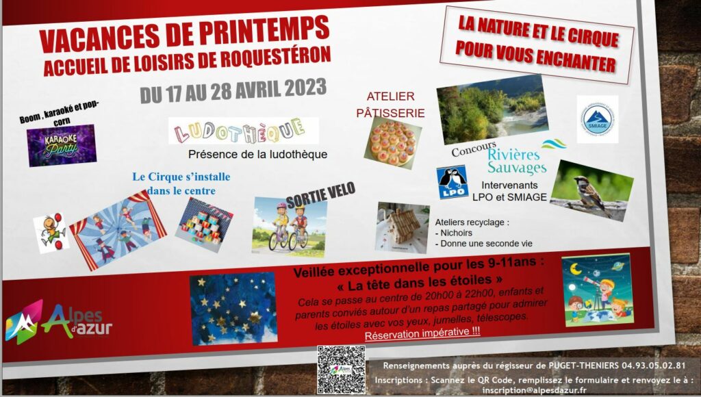L’Accueil de Loisirs des vacances de printemps de la communauté de communes Alpes d’Azur accueille vos enfants du 17 au 28 avril 2023 dans l’école de Roquestéron.